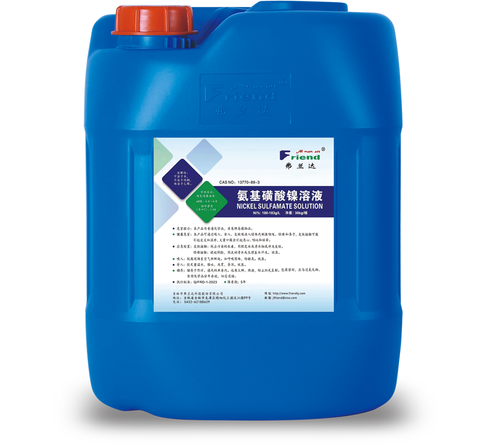 氨基磺酸鎳溶液(Nickel Sulfamate Solution) 分子式:Ni(NH?SO?)? 分子量:250.87 性 狀:深綠色透明液體。 特 性:高純鎳粉為原料;產(chǎn)品純度高,穩(wěn)定性好。 用 途:主要用于精密電鍍、電鑄、電子工業(yè)等。 包 裝:HDPE桶裝,每桶30公斤。 儲(chǔ) 運(yùn):運(yùn)輸時(shí)包裝要密封,運(yùn)輸過程中防止受熱,貯存在陰涼,通風(fēng)處。